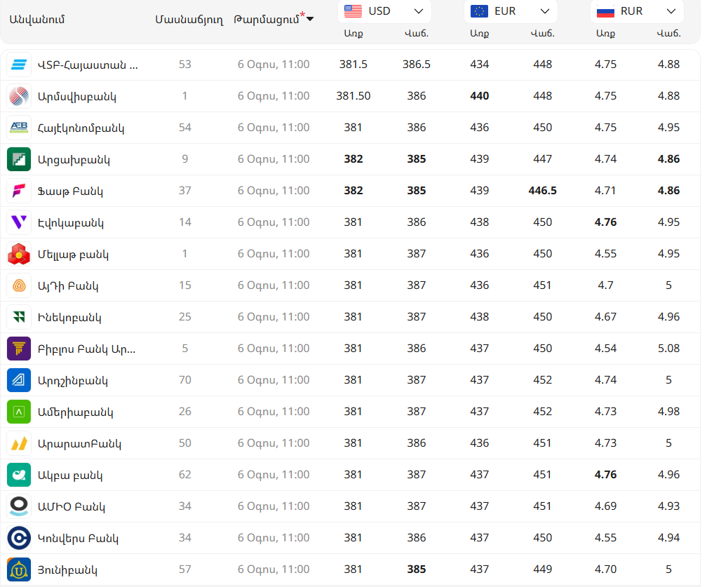Ներկայացնում ենք Հայաստանի բանկերի կողմից գնվող և վաճառվող արտարժույթների փոխարժեքները օգոստոսի 6-ի դրությամբ՝ ըստ rate.am-ի: