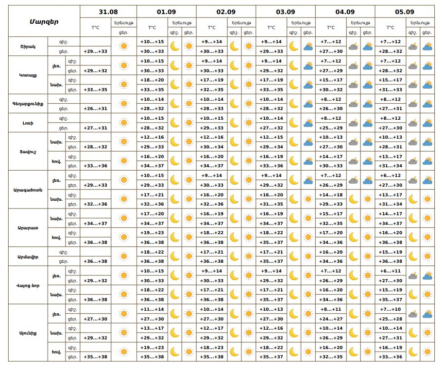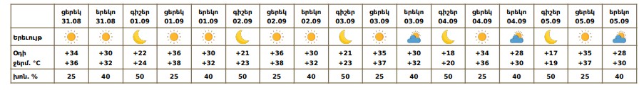 Հանրապետության տարածքում օգոստոսի 31-ի ցերեկը, սեպտեմբերի 1-5-ին սպասվում է առանց տեղումների եղանակ: Քամին՝ հարավային 2-5մ/վ։ Օդի ջերմաստիճանն օգոստոսի 31-ից սեպտեմբերի 2-ին աստիճանաբար կբարձրանա 2-5 աստիճանով։
