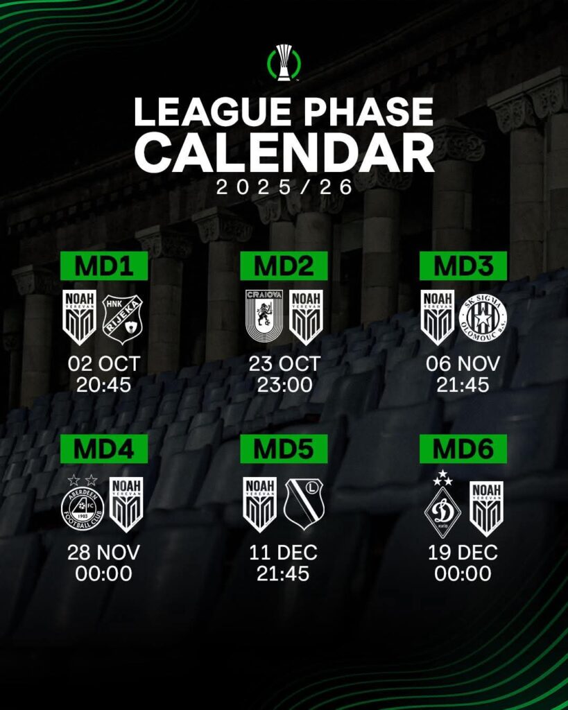 Հիշեցնենք, որ Կոնֆերենցիալ լիգայի խաղարկության լիգայի փուլում «Նոան» կմրցի Վարշավայի «Լեգիայի», «Ռիեկայի», «Ունիվերսիտաետա Կրայովայի», Կիևի «Դինամոյի», «Սիգմայի» և «Աբերդինի» հետ։
