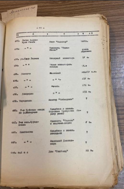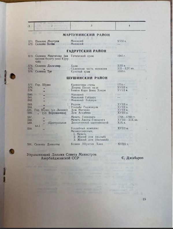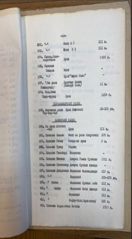 Նշվում է, որ ուսումնասիրվել են Ռուսաստանի Դաշնության Մշակույթի նախարարության Դմիտրի Լիխաչյովի անվան Մշակութային և բնական ժառանգության գիտահետազոտական ինստիտուտի (Ժառանգության ինստիտուտ) արխիվում՝ Անդրկովկասյան հանրապետությունների ֆոնդում առկա 1946-1989թթ. կազմված և ԽՍՀՄ Մշակույթի նախարարությանը ներկայացված Խորհրդային Ադրբեջանի հուշարձանների քսանից ավելի պաշտոնական ցանկեր։