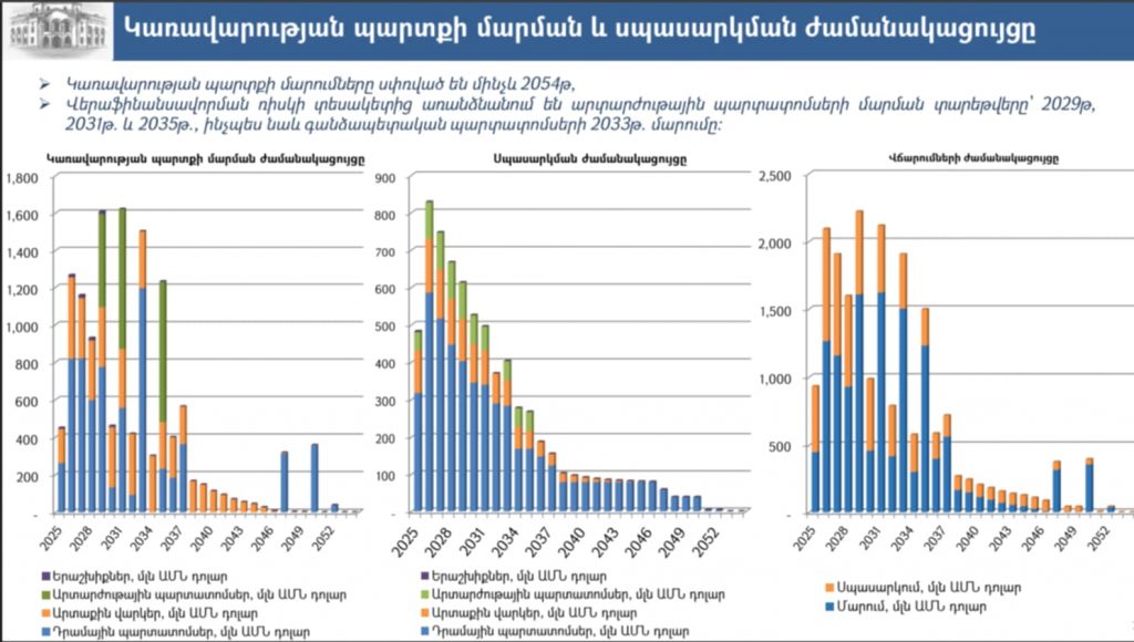 Հավելենք, որ կառավարության պարտքի մարումները ներկայում սփռված են մինչև 2054 թվականը։ Ըստ ֆինանսների նախարարության՝ վերաֆինանսավորման ռիսկի տեսակետից առանձնանում են արտարժութային պարտատոմսերի մարման տարեթվերը՝ 2029 թ․, 2031 թ․ և 2035 թ․։