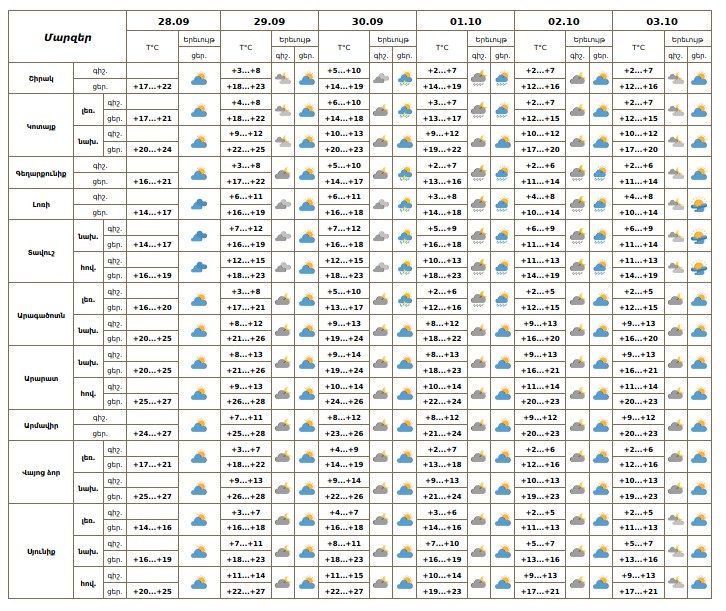 Օդի ջերմաստիճանը սեպտեմբերի 28-ի ցերեկը, 29-ին աստիճանաբար կբարձրանա 3-5 աստիճանով։