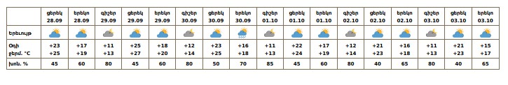 Հանրապետության տարածքում սեպտեմբերի 28-ի ցերեկը, 29-ին, 30-ի գիշերը, հոկտեմբերի 3-ին սպասվում է առանց տեղումների եղանակ։ Սեպտեմբերի 30-ի ցերեկը, հոկտեմբերի 1-2-ին՝ գիշերը և կեսօրից հետո առանձին շրջաններում սպասվում է անձրև։