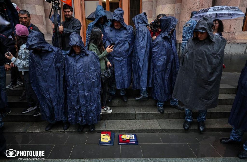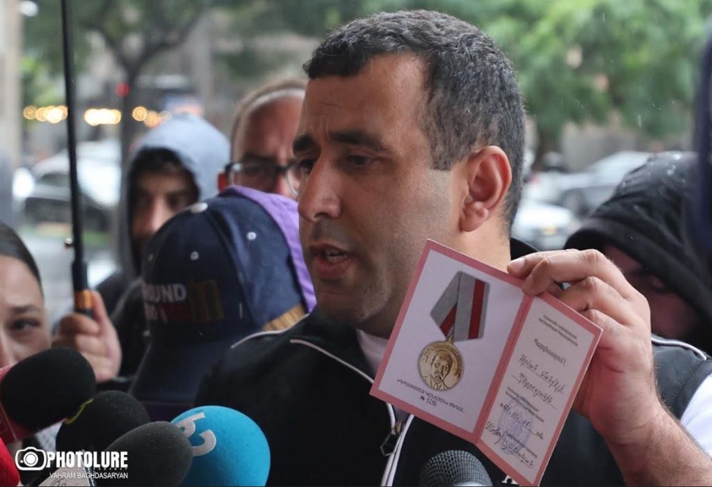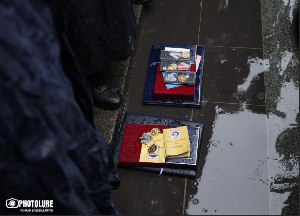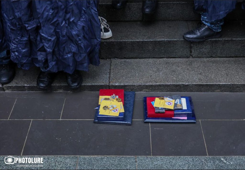 02.10.2025 | 11:55Պատերազմի որոշ մասնակիցներ Կառավարության շենքի դիմաց, ի նշան բողոքի, հանձնում են մեդալները։