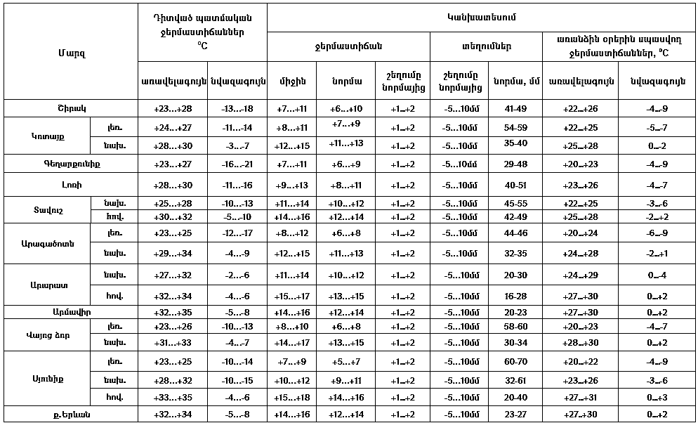 Օդի ամսական միջին ջերմաստիճանը հանրապետության ողջ տարածքում սպասվում է նորմայից բարձր 1-2 աստիճանով, տեղումների քանակը նորմայից պակաս։ Մեզ սպասվում է նորմայից տաք և սակավատեղում հոկտեմբեր։