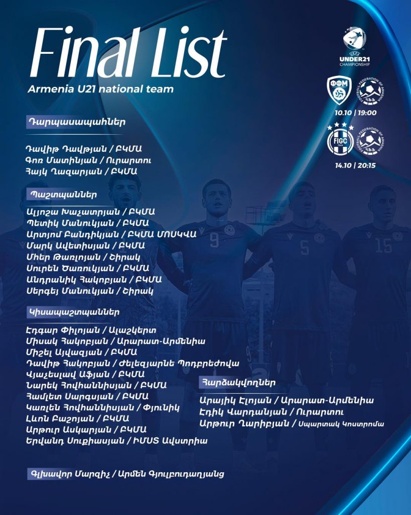 Արմեն Գյուլբուդաղյանցը հրապարակել է այն ֆուտբոլիստների ցանկը, որոնք պատրաստվելու են ՈՒԵՖԱ Մ-21 տարեկանների Եվրոպայի 2027 թվականի առաջնության որակավորման փուլի Հյուսիսային Մակեդոնիայի և Իտալիայի դեմ խաղերին։