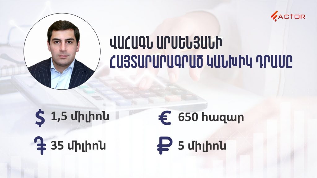 Բնակարաններ Երևանի Կենտրոնում և ԱՄԷ-ում, թանկարժեք ժամացույցներ, 1,5 միլիոն դոլար կանխիկ, հանգստի համար ծախսված ավելի քան 170 միլիոն դրամ։ Factor.am-ն ուսումնասիրել է այսօր՝ հոկտեմբերի 9-ին, Վայոց ձորի մարզպետի պաշտոնում նշանակված Վահագն Արսենյանի՝ Կոռուպցիայի կանխարգելման հանձնաժողով ներկայացրած վերջին հայտարարագիրը (2024թ.):
