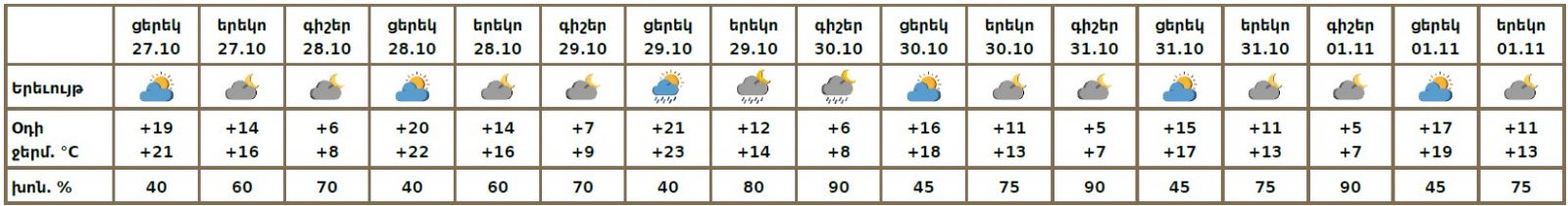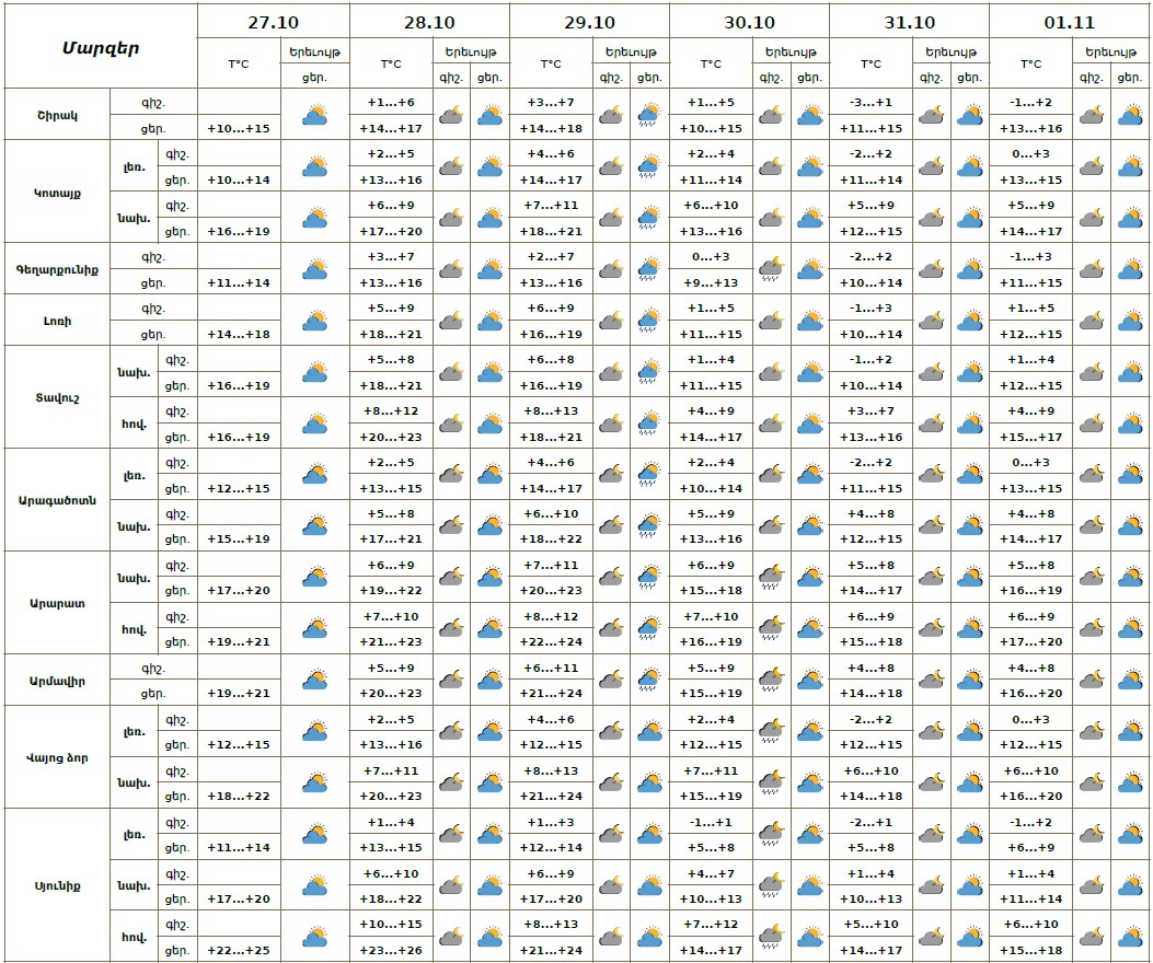 Հանրապետության տարածքում հոկտեմբերի 27-ի ցերեկը, 28-ին, 31-ին, նոյեմբերի 1-ին սպասվում է առանց տեղումների եղանակ: Հոկտեմբերի 29-ի ցերեկը, 30-ի գիշերն առանձին շրջաններում սպասվում է անձրև։ Քամին արևմտյան՝ 2-5մ/վ: Հոկտեմբերի 29-ին առանձին շրջաններում հնարավոր է քամու ուժգնացում 16-19մ/վ արագությամբ։ Օդի ջերմաստիճանը հոկտեմբերի 27-ի ցերեկը, 28-ին աստիճանաբար կբարձրանա ևս 2-3 աստիճանով։