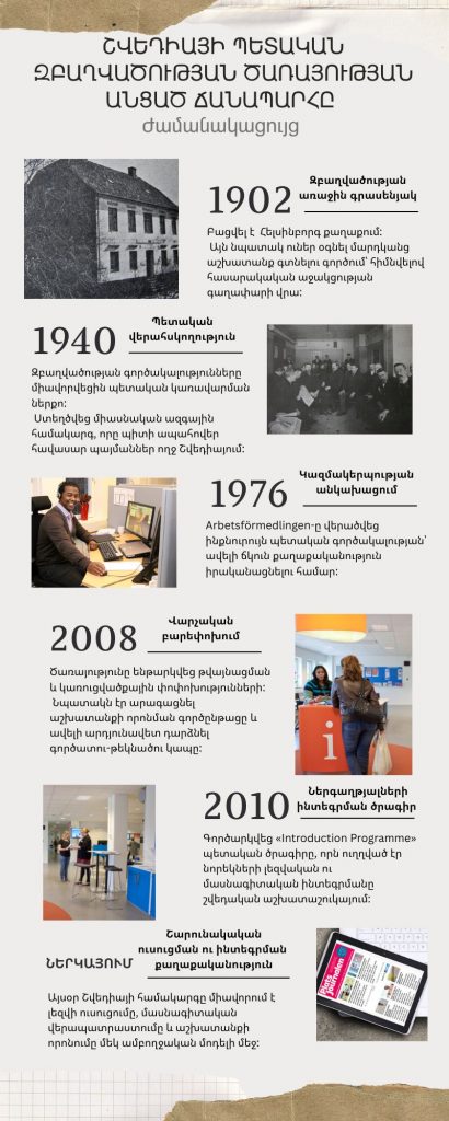 Դեռևս 1902 թվականին Շվեդիայում հիմնադրվել է երկրի առաջին աշխատանքի գրասենյակը՝ Հելսինգբորգ քաղաքում։ Դա դարձավ այն ուղիղ նախատիպը, որից հետագայում ձևավորվեց երկրի պետական զբաղվածության ծառայությունը (Arbetsförmedlingen)՝ աշխատաշուկայի կառավարման և զբաղվածության քաղաքականության հիմնական գործակալությունը։