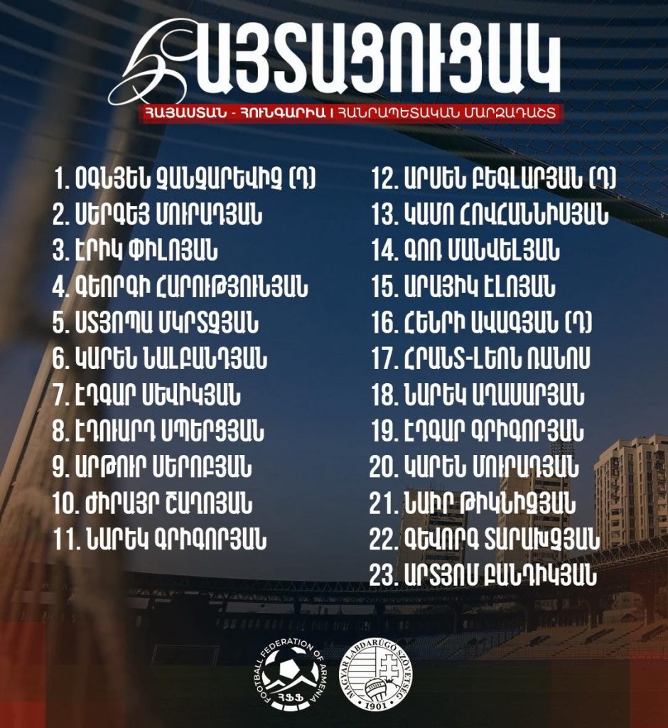 Հայաստանի հավաքականի հայտացուցակը Հունգարիայի դեմ խաղում
