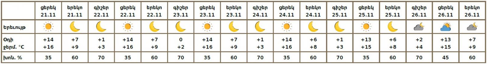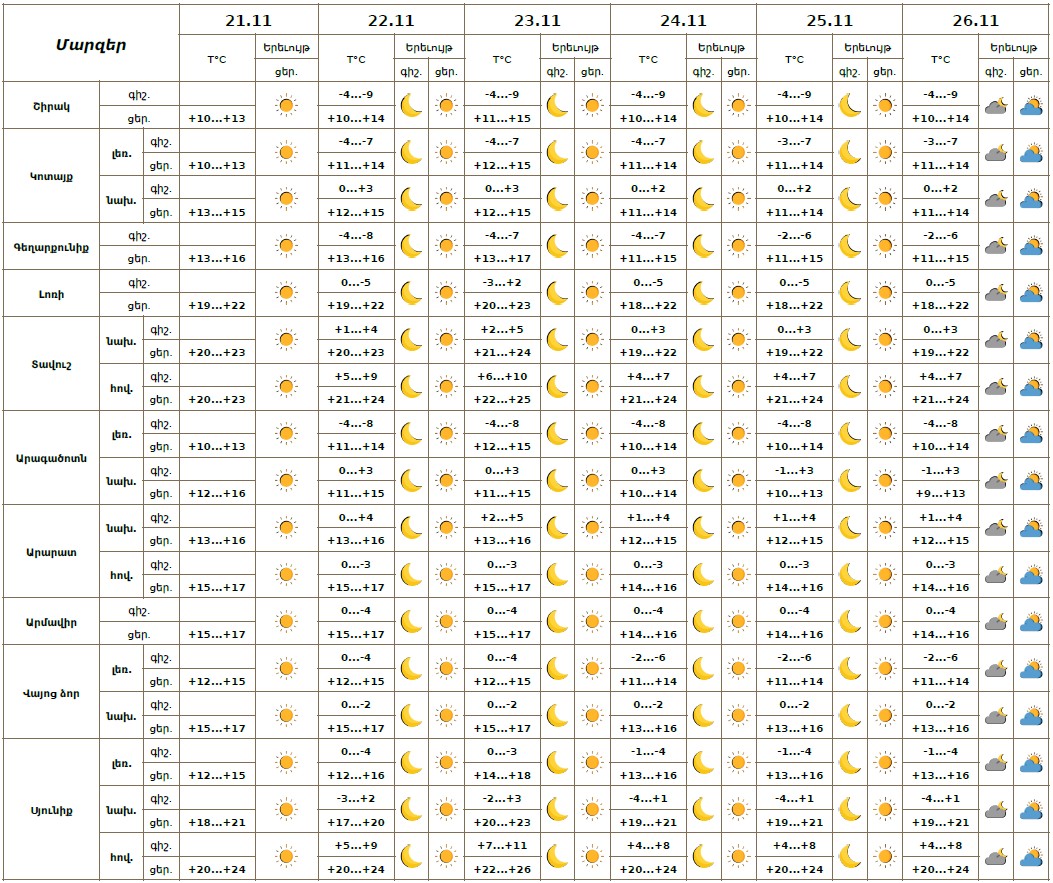 Հանրապետության տարածքում` նոյեմբերի 21-ի ցերեկը, 22-26-ին սպասվում է առանց տեղումների եղանակ, լուսադեմին Արարատյան և Շիրակի դաշտում սպասվում է կարճատև մառախուղ: