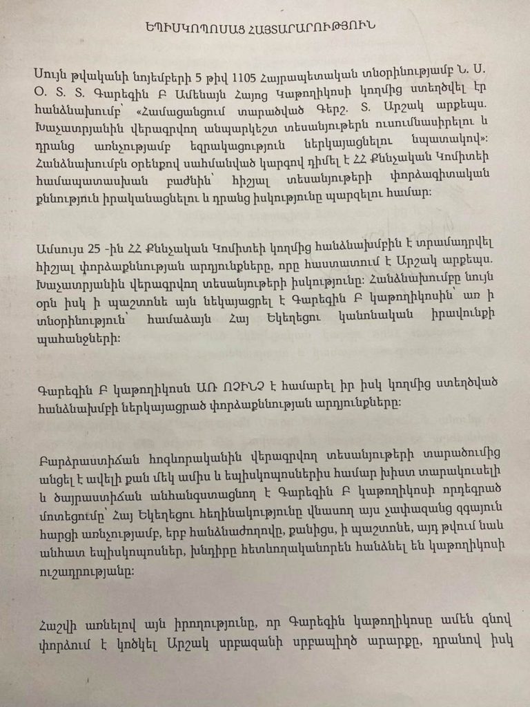 «Հանձնախումբը նույն օրն իսկ ի պաշտոնե այն ներկայացրել է Գարեգին Բ կաթողիկոսին՝ ի տնօրինություն՝ համաձայն Հայ եկեղեցու կանոնական իրավունքի պահանջների։ Գարեգին Բ կաթողիկոսն ԱՌ ՈՉԻՆՉ է համարել իր իսկ կողմից ստեղծված հանձնախմբի ներկայացրած փորձաքննության արդյունքները»,-նշվում է հրապարակված հայտարարության մեջ։