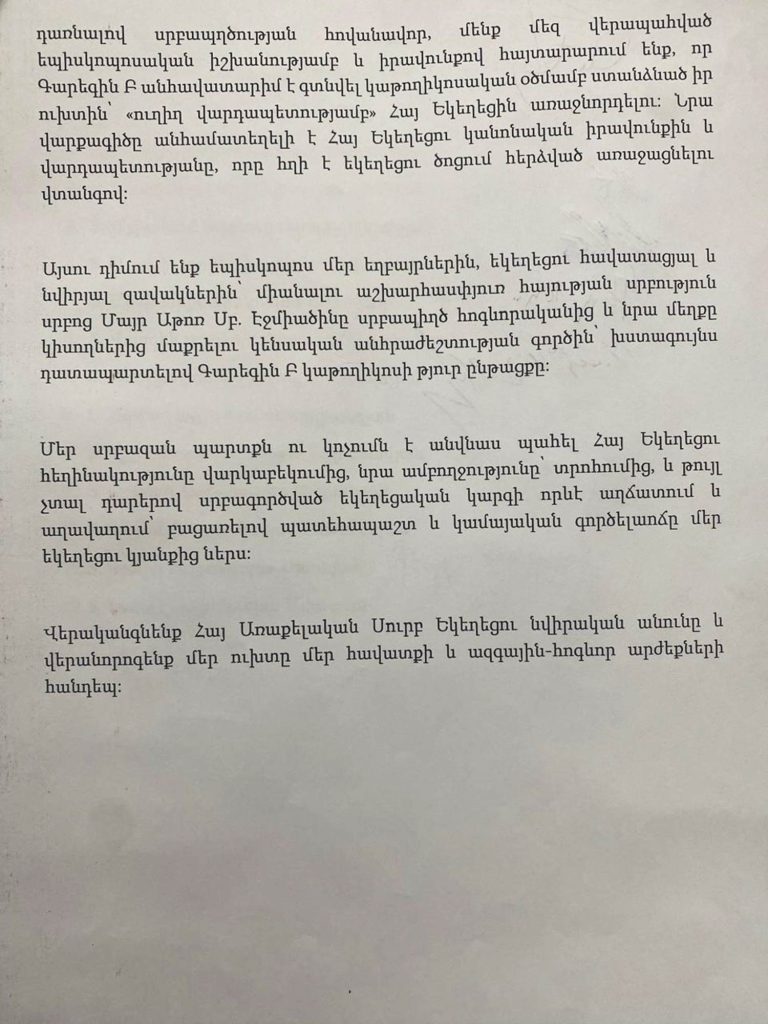 Տեքստից ենթադրվում է նաև, որ եպիսկոպոսները համարում են՝ կաթողիկոսի վարքագիծը անհամատեղելի է Հայ Եկեղեցու կանոնական իրավունքին և վարդապետությանը։ Նրանք դատապարտել են «Գարեգին Բ կաթողիկոսի թյուր ընթացքը»։