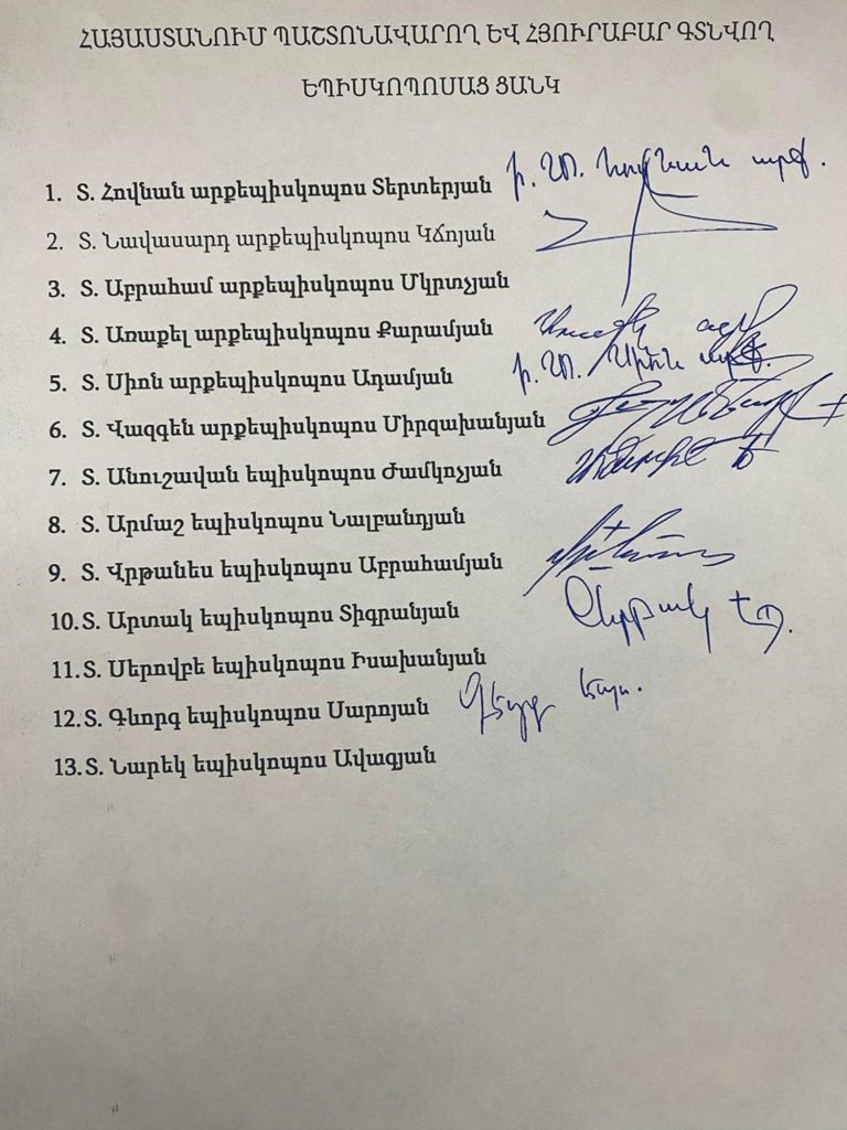 Լուսանկարներից պարզ է դառնում, որ 13 հոգևորականներից հայտարարության տակ ստորագրել են 9-ը։ Չստորագրած հոգևորականներն են Աբրահամ արքեպիսկոպոս Մկրտչյանը, Սերովբե եպիսկոպոս Իսախանյանը, Արմաշ եպիսկոպոս Նալբանդյանը և Նարեկ եպիսկոպոս Ավագյանը։