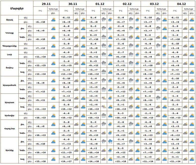 Հանրապետության տարածքում նոյեմբերի 30-ին, դեկտեմբերի 4-ին սպասվում է առանց տեղումների եղանակ։ Նոյեմբերի 30-ի լուսադեմին Արարատյան և Շիրակի դաշտում սպասվում է կարճատև մառախուղ: Դեկտեմբերի 1-3-ին առանձին շրջաններում սպասվում են տեղումներ, լեռնային շրջաններում գիշերային ժամերին ձյան և ձնախառն անձրևի, հովտային շրջաններում՝ անձրևի տեսքով: Քամին արևմտյան՝ 2-5մ/վ: Օդի ջերմաստիճանը դեկտեմբերի 1-3-ին աստիճանաբար կնվազի 3-4 աստիճանով, Արարատյան դաշտում և նրա նախալեռներում՝ էապես չի փոխվի։
