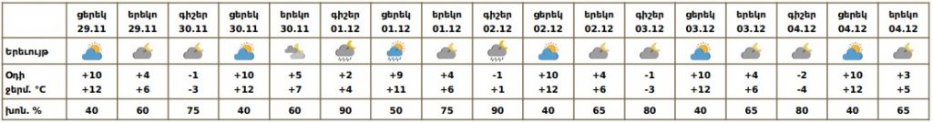 Երևան քաղաքում նոյեմբերի 30-ին, դեկտեմբերի 2-ի ցերեկը, 3-4-ին սպասվում է առանց տեղումների եղանակ։ Դեկտեմբերի 1-ին սպասվում է, դեկտեմբերի 2-ի գիշերը հնարավոր է անձրև։