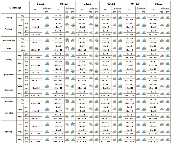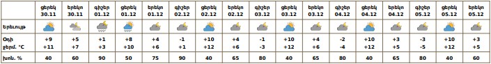 Դեկտեմբերի 1-ին, 2-ի գիշերը առանձին շրջաններում սպասվում են թույլ տեղումներ, լեռնային շրջաններում գիշերային ժամերին ձյան և ձնախառն անձրևի, հովտային շրջաններում՝ անձրևի տեսքով: Քամին արևմտյան՝ 2-5մ/վ: Օդի ջերմաստիճանը դեկտեմբերի 1-3-ին աստիճանաբար կնվազի 3-4 աստիճանով, Արարատյան դաշտում և նրա նախալեռներում՝ էապես չի փոխվի։