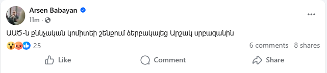ԱԱԾ-ն քննչական կոմիտեի շենքում ձերբակալեց Արշակ սրբազանին, ֆեյսբուքյան գրառմամբ հայտնում է փաստաբան Արսեն Բաբայանը։