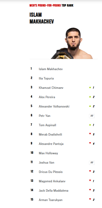 Անկախ քաշային կարգից վարկանիշային ցուցակը գլխավորում է կիսամիջին քաշային կարգում չեմպիոն Իսլամ Մախաչևը։ Թեթև քաշային կարգի չեմպիոն Իլյա Տոպուրիան երկրորդն է, իսկ երրորդ տեղ է բարձրացել միջին քաշային կարգի գոտու տիրակալ Խամզատ Չիմաևը։