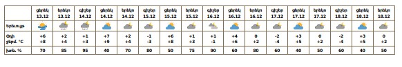 Օդի ջերմաստիճանը դեկտեմբերի 15-17-ին աստիճանաբար կնվազի՝ գիշերը 4-6, ցերեկը՝ 2-4 աստիճանով։