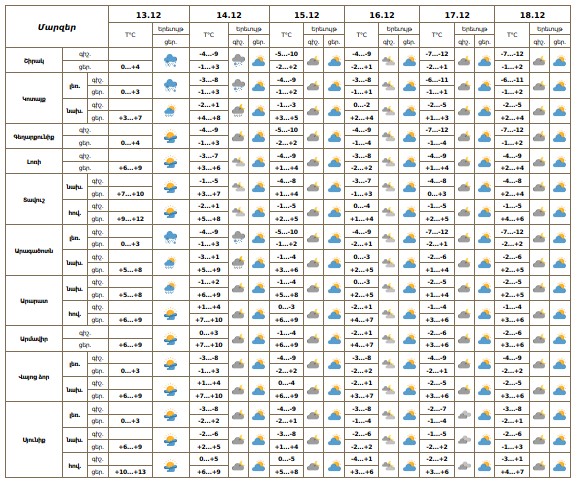 Հանրապետության տարածքում դեկտեմբերի 13-ի ցերեկը, 14-ի գիշերն առանձին շրջաններում սպասվում են թույլ տեղումներ ՝ լեռնային շրջաններում ձյան և ձնախառն անձրևի, հովտային շրջաններում՝ անձրևի տեսքով։ Դեկտեմբերի 14-ի ցերեկը, 15-18-ին սպասվում է առանց տեղումների եղանակ։