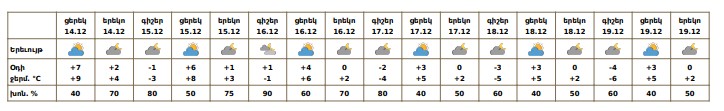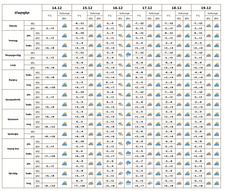 Հանրապետության տարածքում դեկտեմբերի 14-ի ցերեկը, 15-ին, 16-ի գիշերը, 17-19-ին սպասվում է առանց տեղումների եղանակ։ Դեկտեմբերի 16-ի ցերեկն առանձին շրջաններում սպասվում են տեղումներ։ Դեկտեմբերի 17-19-ին Արարատյան և Շիրակի դաշտի ցածրադիր հատվածներում առավոտյան ժամերին սպասվում է մառախուղ։ Քամին արևմտյան՝ 2-5մ/վ, դեկտեմբերի 14-ի ցերեկը Շիրակի, Լոռու, Տավուշի, Արագածոտնի, Գեղարքունիքի և Սյունիքի մարզերի, Արարատյան դաշտի առանձին հատվածներում սպասվում է քամու ուժգնացում՝ 17-20 մ/վ արագությամբ։