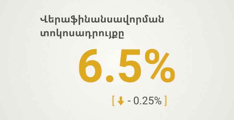 Հայաստանի Հանրապետության կենտրոնական բանկի խորհրդի՝ դեկտեմբերի 16-ի նիստի ժամանակ որոշվել է իջեցնել վերաֆինանսավորման տոկոսադրույքը 0.25 տոկոսային կետով՝ սահմանելով 6․50%: Հայաստանի Հանրապետության կենտրոնական բանկի կողմից տրամադրվող լոմբարդային ռեպոյի տոկոսադրույքը սահմանվել է 8.00 %։ Հայաստանի Հանրապետության կենտրոնական բանկի կողմից բանկերից ներգրավվող միջոցների տոկոսադրույքը սահմանվել է 5.00 %: