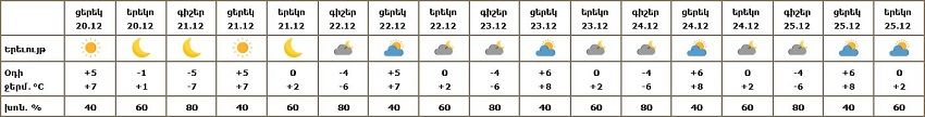 Երևան քաղաքում դեկտեմբերի 20-ի ցերեկը, 21-25-ը սպասվում է առանց տեղումների եղանակ։