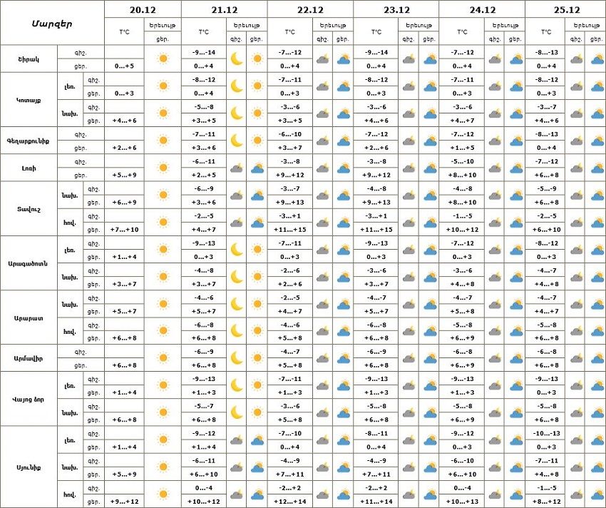 Հանրապետության տարածքում դեկտեմբերի 20-ի ցերեկը, 21-25-ը սպասվում է առանց տեղումների եղանակ։