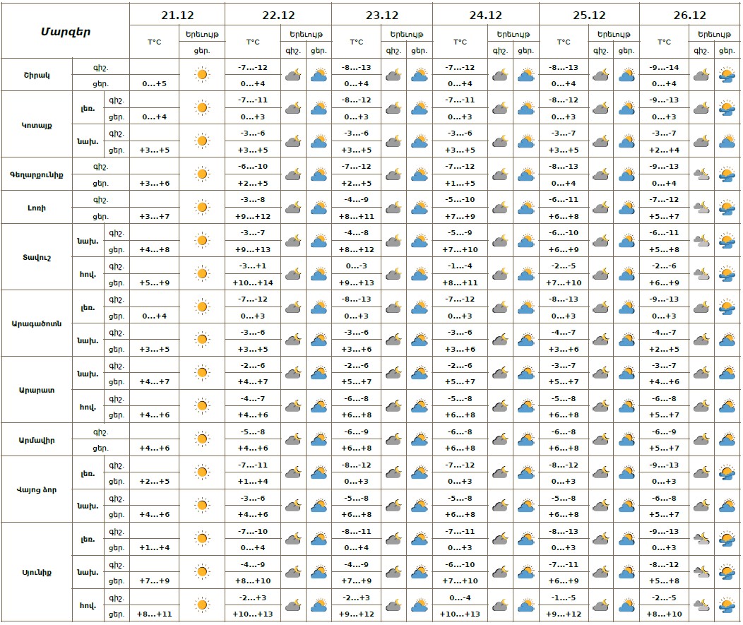 Հանրապետության տարածքում դեկտեմբերի 21-ի ցերեկը, 22-26-ին սպասվում է առանց տեղումների եղանակ։ Քամին հյուսիսային՝ 2-5մ/վ, դեկտեմբերի 22-ին, 23-ի գիշերն առանձին շրջաններում սպասվում է քամու ուժգնացում՝ 12-15 մ/վ արագությամբ։ Օդի ջերմաստիճանն էապես չի փոխվի։
