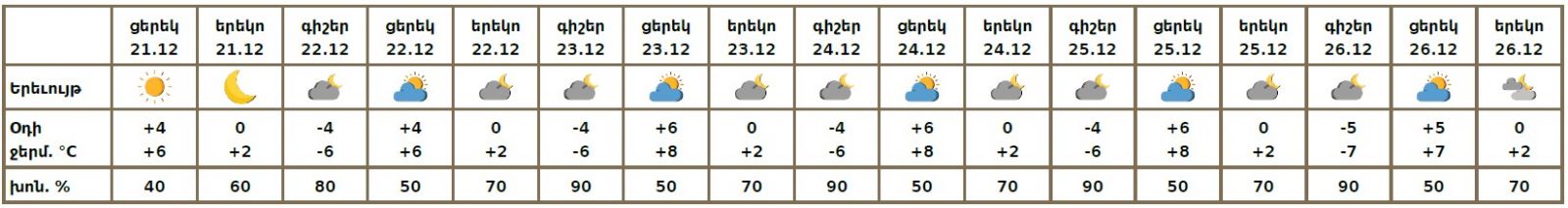 Երևան քաղաքում՝ դեկտեմբերի 21-ի ցերեկը, 22-26-ին սպասվում է առանց տեղումների եղանակ։ Այս մասին հայտնում են Հիդրոօդերևութաբանության և մոնիթորինգի կենտրոնից։