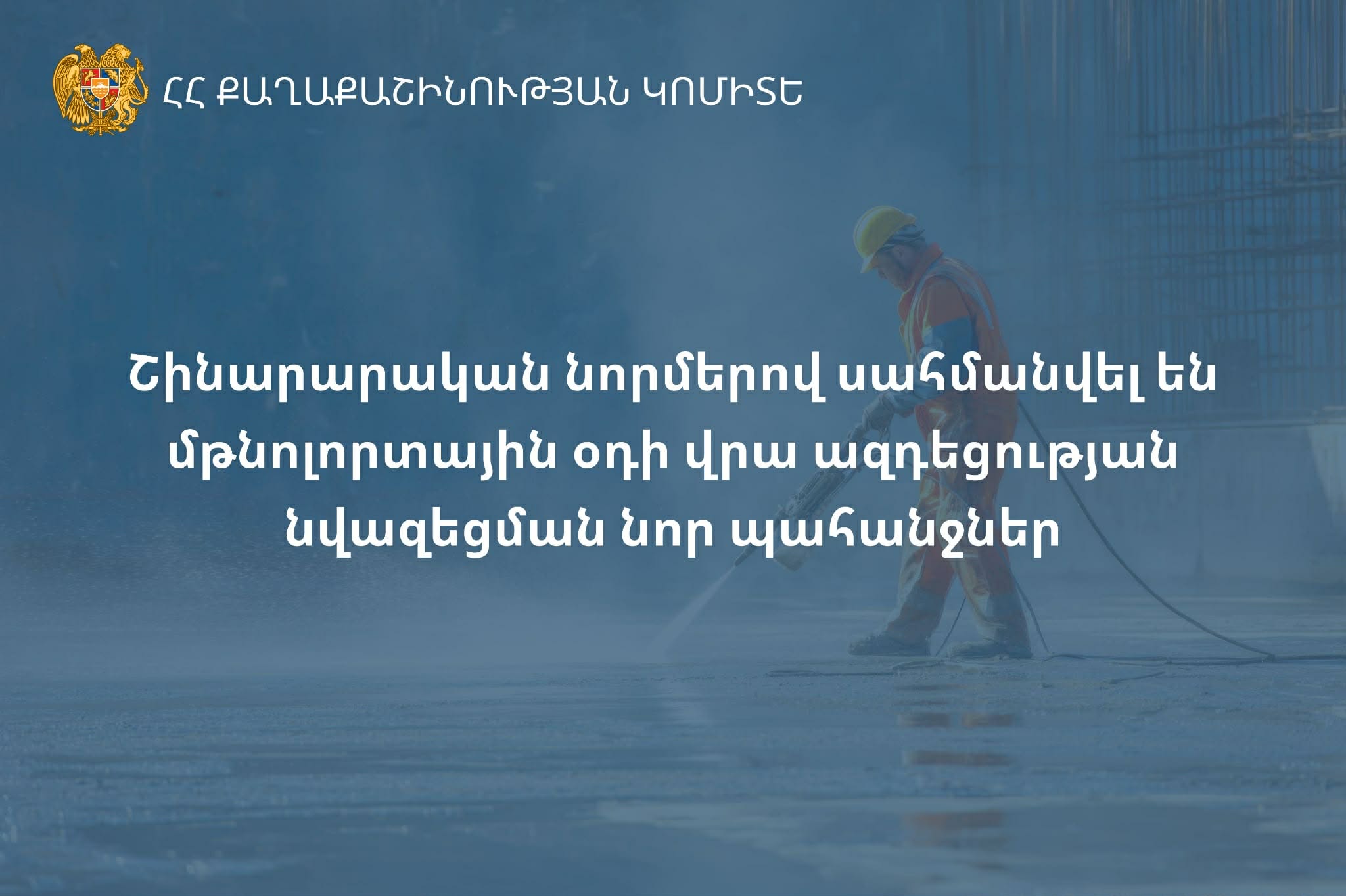 ՀՀ քաղաքաշինության կոմիտեից հայտնում են, որ մթնոլորտային օդի աղտոտվածության խնդիրների շարքում շինարարության գործոնը նվազագույնի հասցնելու նպատակով Կոմիտեն նոր պահանջներ է սահմանել «Շինարարական արտադրության կազմակերպում» շինարարական նորմերով, որոնք առաջիկայում կհրապարակվեն arlis.am հարթակում և կմտնեն գործողության մեջ։