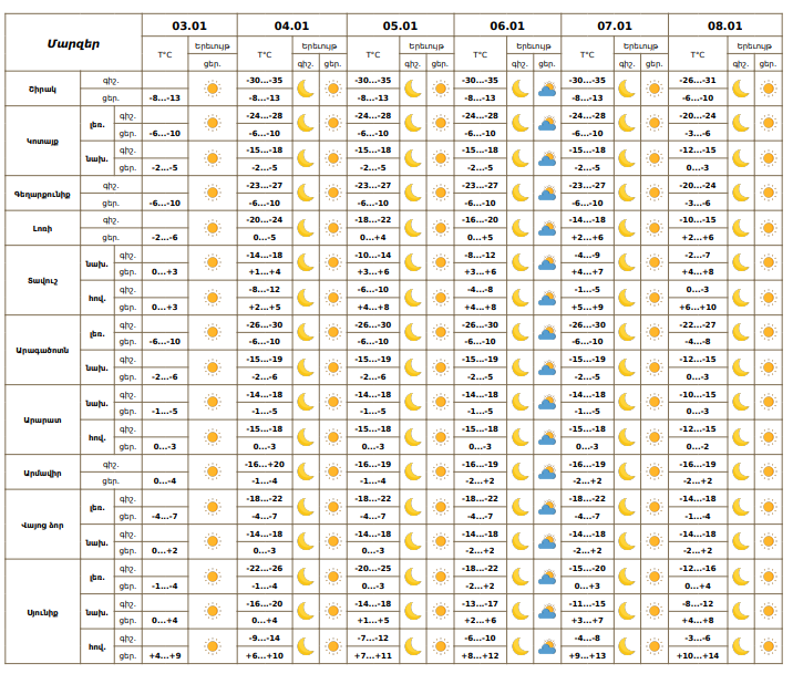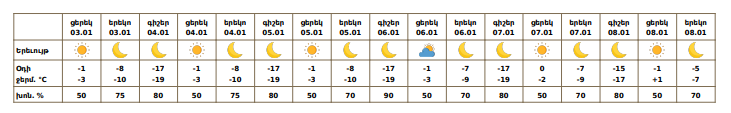 Հանրապետության տարածքում հունվարի 4-8-ին սպասվում է առանց տեղումների եղանակ։ Քամին հյուսիսարևմտյան՝ 2-5մ/վ։ Օդի ջերմաստիճանը հունվարի 4-ի գիշերը կնվազի ևս 3-4աստիճանով, հունվարի 5-8-ին Լոռիում, Տավուշում և Սյունիքում աստիճանաբար կբարձրանա 8-10 աստիճանով, հուվարի 8-ին հանրապետության մնացած շրջաններում կբարձրանա 3-4 ատիճանով։