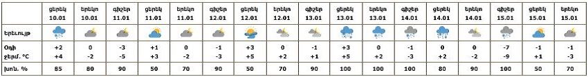 Երևան քաղաքում հունվարի 13-ի ցերեկը, 14-ին, 15-ի գիշերը սպասվում է ձյուն: Հունվարի 11-12-ը, 13-ի գիշերը, 15-ի ցերեկը սպասվում է առանց տեղումների եղանակ: