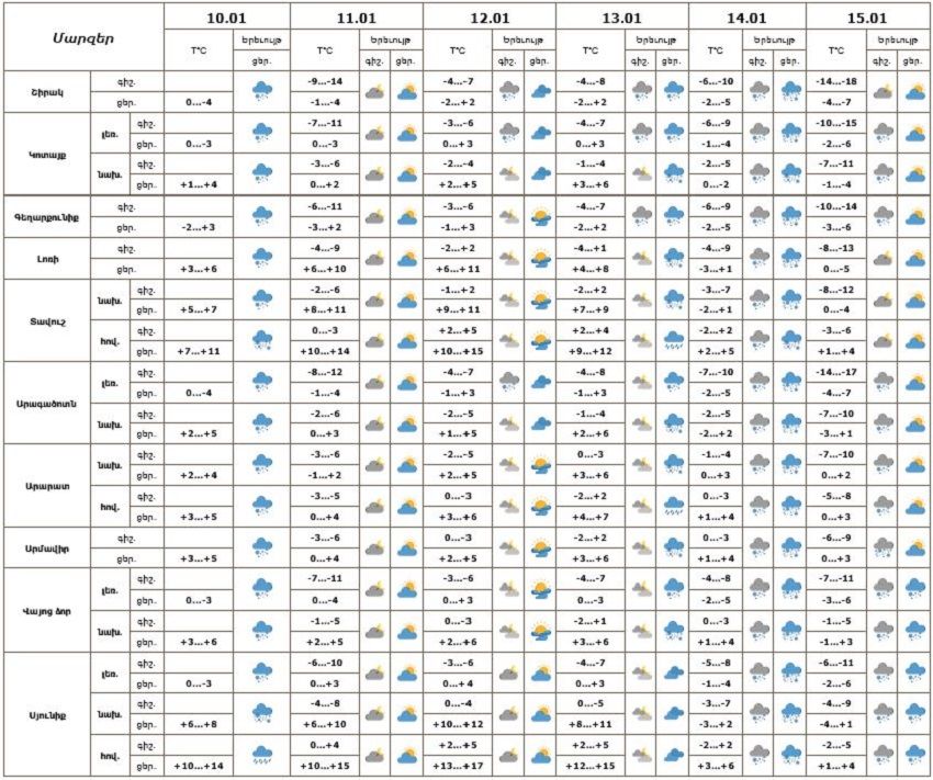 Հանրապետության տարածքում հունվարի 12-ի գիշերը և առավոտյան, 13-15-ն առանձին շրջաններում սպասվում է ձյուն։ Հունվարի 11-ին և 12-ի ցերեկը սպասվում է առանց տեղումների եղանակ։ Հունվարի 10-ի երեկոյան, 11-ի գիշերը և առավոտյան ժամերին հանրապետության ավտոճանապարհներին սպասվում է մերկասառույց։