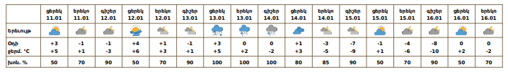 Երևան քաղաքում հունվարի 11-ի և 14-ի ցերեկը, 12-ին, 13-ի գիշերը, 15- 16-ին սպասվում է առանց տեղումների եղանակ:Հունվարի 13-ի ցերեկը, 14-ի գիշերը և առավոտյան սպասվում է ձյուն։ Այս մասին հայտնում են Հիդրոօդերևութաբանության և մոնիթորինգի կենտրոնից։