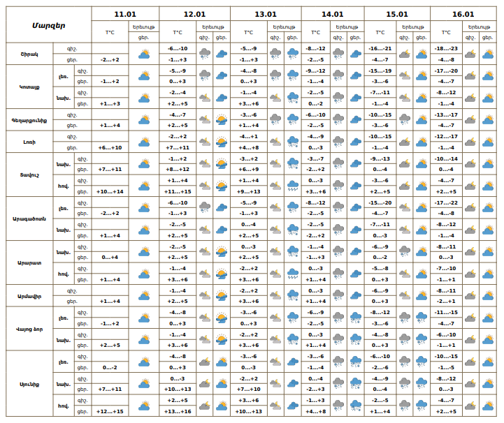 Հանրապետության տարածքում հունվարի 11-ի և 12-ի ցերեկը, 16-ին սպասվում է առանց տեղումների եղանակ։ Հունվարի 12-ի գիշերը և առավոտյան, 13-15-ին առանձին շրջաններում սպասվում է ձյուն։ Քամին հարավարևմտյան՝ 2-5մ/վ, հունվարի 11-ի ցերեկը, 12-ին առանձին վայրերում սպասվում է քամու ուժգնացում 17-20 մ/վրկ արագությամբ։