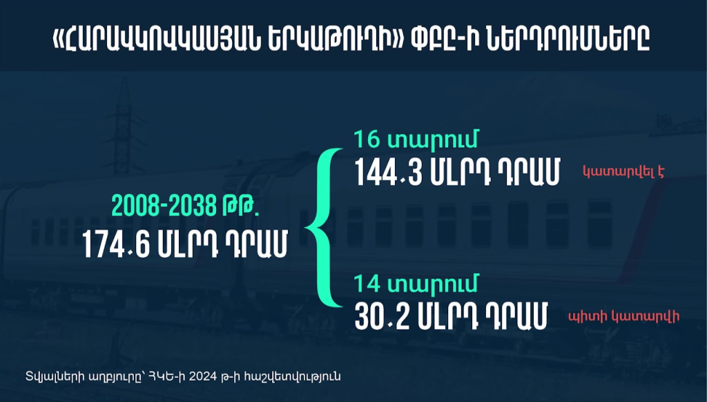 Միևնույն ժամանակ՝ ըստ 2024-ի հաշվետվության, ՀԿԵ-ն կատարել իր կոնցեսիայի ժամանակաշրջանի՝ 30 տարիների ներդրումների պարտավորության մեծ մասը՝ 82․3%-ը։ Այսպես՝ 2008-2038 թթ. ընթացքում կոնցեսիոները ենթակառուցվածքի բարելավման մեջ պետք է ներդնի 174․6 մլրդ դրամ (2008-ին սա համարժեք էր 575 մլն ԱՄՆ դոլարի)։ 2024-ի տարեվերջի դրությամբ այդ գումարից մնացել է 30․2 մլրդ դրամը։ Այսինքն՝ անցած 16 տարիներին ՀԿԵ-ն ներդրել է 144․3 մլրդ դրամ, հետեւաբար՝ հաջորդ 14 տարում պետք է ներդնի ընդամենը 30․2 մլրդ դրամ։