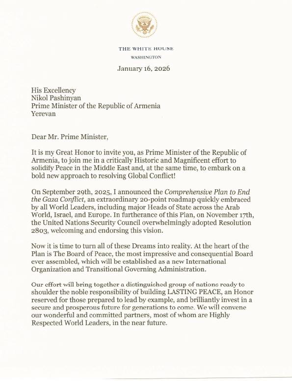«Վարչապետ Նիկոլ Փաշինյանը ստացել է ԱՄՆ նախագահ Դոնալդ Թրամփի պաշտոնական հրավերը՝ Խաղաղության խորհրդին որպես հիմնադիր անդամ միանալու վերաբերյալ։