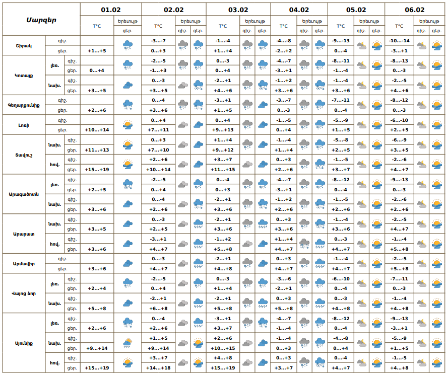 Փետրվարի 5-6-ին սպավում է առանց տեղումների եղանակ։ Քամին` հարավարևմտյան` 3-6մ/վ, փետրվարի 1-ի ցերեկը, 2-5-ին առանձին շրջաններում սպասվում է նաև քամու ուժգնացում՝ 17-20 մ/վ արագությամբ։ Փետրվարի 2-3-ին գիշերը և առավոտյան Շիրակի դաշտի ցածրադիր հատվածներում, Արագածոտնի և Կոտայքի նախալեռներում, Արարատյան դաշտում սպասվում է մառախուղ։
