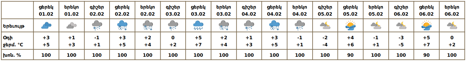 Երևան քաղաքում փետրվարի 1-ի ցերեկը, 5-6-ին սպասվում է առանց տեղումների եղանակ։ Փետրվարի 2-4-ին սպասվում են տեղումներ՝ ձյան և ձնախառն անձրևի տեսքով։ Փետրվարի 2-3-ին գիշերը և առավոտյան սպասվում է մառախուղ։ Այս մասին հայտնում են Հիդրոօդերևութաբանության և մոնիթորինգի կենտրոնից։