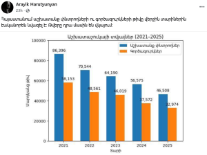 Վարչապետի աշխատակազմի ղեկավար Արայիկ Հարությունյանը գրաֆիկ է հրապարակել, որում, ըստ նրա, ներկայացված է Հայաստանում աշխատանք փնտրողների և գործազուրկների թիվը 2021-2025 թվականներին։ Այդ թվերը, սակայն, մի քանի անգամ ցածր են Վիճակագրական կոմիտեի շտեմարանում ներկայացված թվերից։