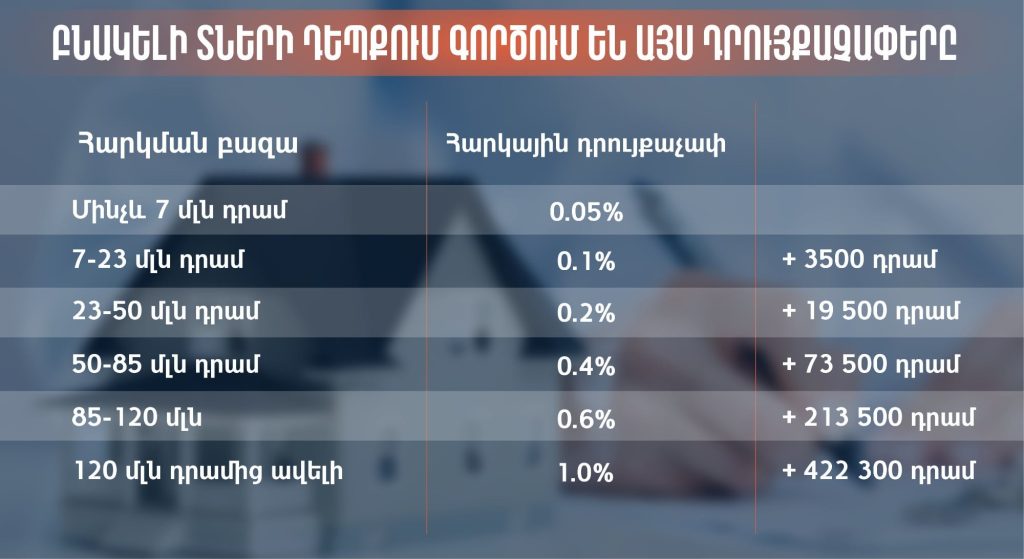 Բնակարանների և անհատական բնակելի տների համար հարկային բազայի նոր սանդղակները և դրույքաչափերը տարբեր են։ Այստեղ էլ յուրաքանչյուրն իր հերթին ունի վեց սանդղակ․ որքան բարձր է գույքի արժեքը, այնքան շատ է գույքահարկը։