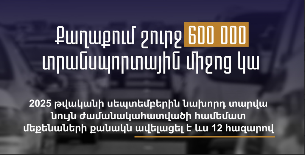 Երևանի օդի աղտոտման հիմնական պատճառներից մեկը տրանսպորտն է։ Երևանի 2023 թվականի զարգացման ծրագրի համաձայն՝ քաղաքում շուրջ 600 000 տրանսպորտային միջոց կար։ 2025 թվականի սեպտեմբերին նախորդ տարվա նույն ժամանակահատվածի համեմատ մեքենաների քանակն ավելացել է ևս 12 հազարով։