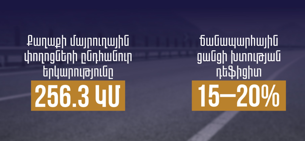 Ըստ Երևան քաղաքի 2024 թվականին հաստատված հատակագծի տվյալների՝ քաղաքի մայրուղային փողոցների ընդհանուր երկարությունը կազմում է 256.3 կմ, իսկ ճանապարհային ցանցի խտության դեֆիցիտը՝ 15–20%։ Արդյունքում առաջանում են մշտական խցանումներ, տրանսպորտային աշխատանքի գերբեռնվածություն և օդի աղտոտման լրացուցիչ աճ։