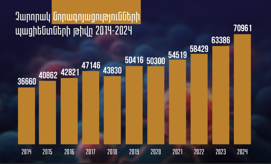 Զուգահեռաբար, վերջին տասնամյակում արձանագրվել է չարորակ նորագոյացությունների տարածվածության կայուն և երկարաժամկետ աճ։ Եթե 2014 թվականի տարեվերջին հաշվառված պացիենտների թիվը կազմել է 36 660, ապա 2024 թվականին այն հասել է 70 961 ցուցանիշին, փաստացի կրկնապատկվելով մեկ տասնամյակի ընթացքում։