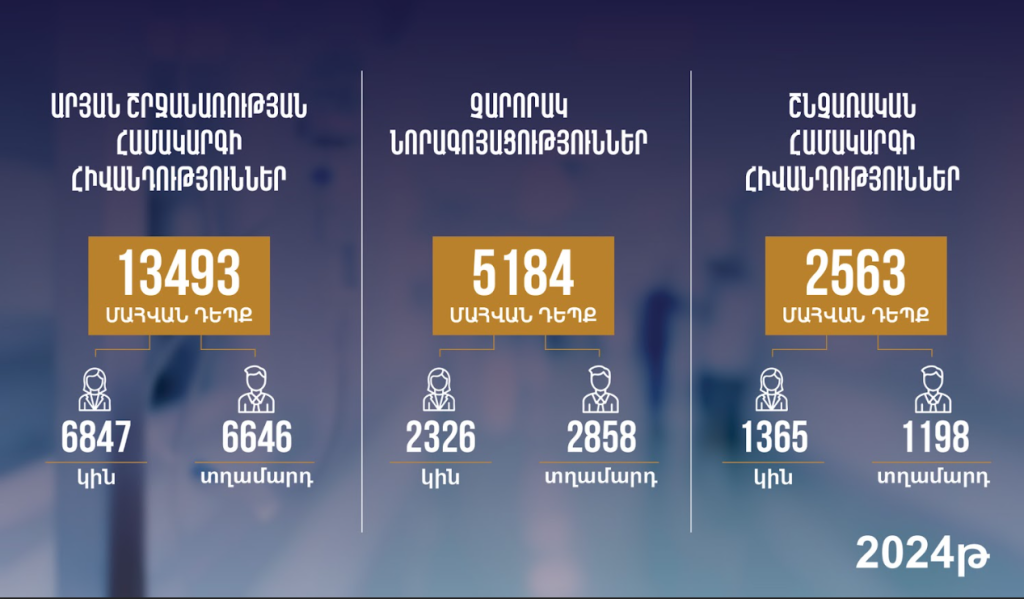 Նույն համատեքստում դիտարկելով ՀՀ բնակչության մահացության պատճառները 2024 թվականին, առաջին տեղում արյան շրջանառության համակարգի հիվանդություններն են, ապա չարորակ նորագոյացությունները և երրորդ տեղում շնչառական համակարգի հիվանդություններն են։
