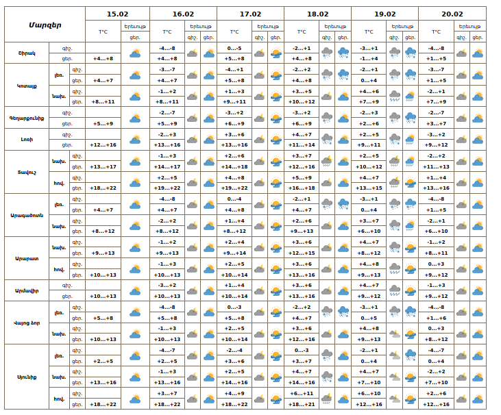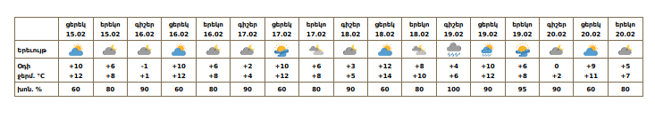 Հանրապետության տարածքում`փետրվարի 15-ի ցերեկը, 16-17-ին, 20-ին սպասվում է առանց տեղումների եղանակ։ Փետրվարի 18-19-ին առանձին շրջաններում սպասվում են տեղումներ․ նախալեռնային և հովտային շրջաններում՝ անձրևի և ձնախառն անձրևի, լեռնային շրջաններում՝ ձյան տեսքով։ Քամին` հարավարևմտյան`3-6մ/վ, առանձին շրջաններում սպասվում է նաև քամու ուժգնացում․ փետրվարի 15-ի ցերեկը, 16-19-ին՝ 14-17մ/վ արագությամբ, լեռնային առանձին հատվածներում բուք՝ ցածր հորիզոնական տեսանելիություն։