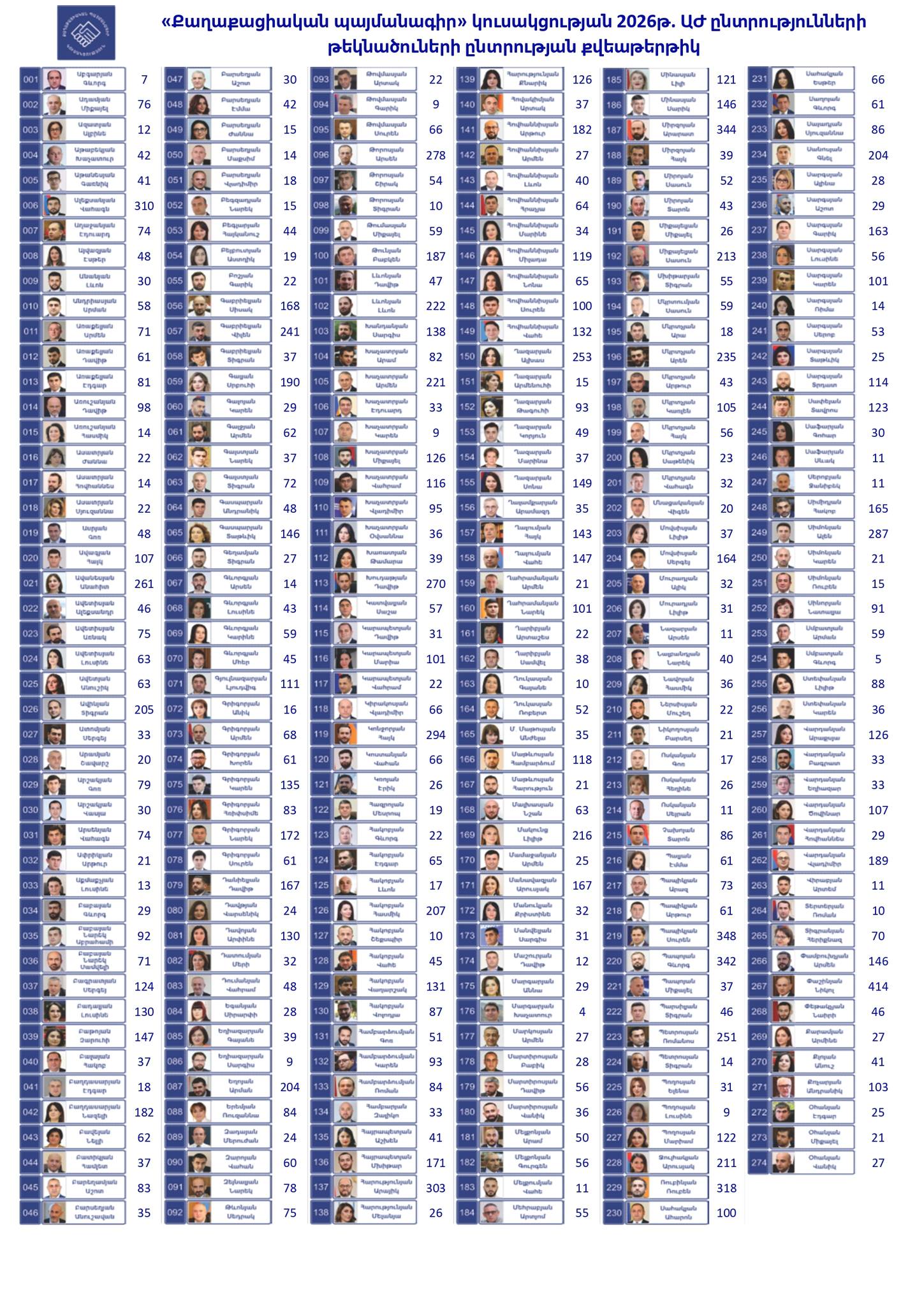 2026 թվականի հերթական ընտրություններում «Քաղաքացիական պայմանագիր» կուսակցության ընտրական ցուցակի հաստատման առաջին փուլի քվեարկության նախնական արդյունքները՝ 23:00-ի դրությամբ։