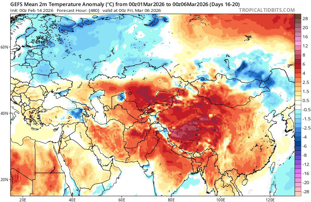 Հ.Գ. Ամերիկյան GEFS անսամբլային կանխատեսման համակարգը, որը համադրում է 30 առանձին կանխատեսումների արդյունքներ մեր տարածշրջանի զգալի մասում մարտի 1-6-ը ջերմաստիճանը կանխատեսում է նորմայից 1-3 աստիճանով ցածր: